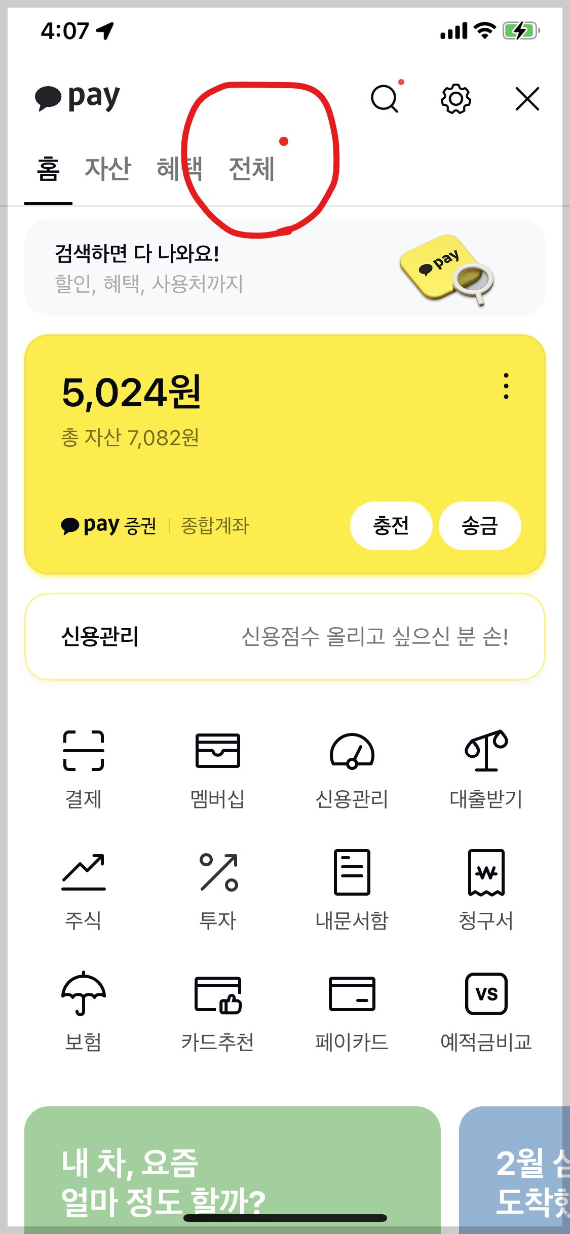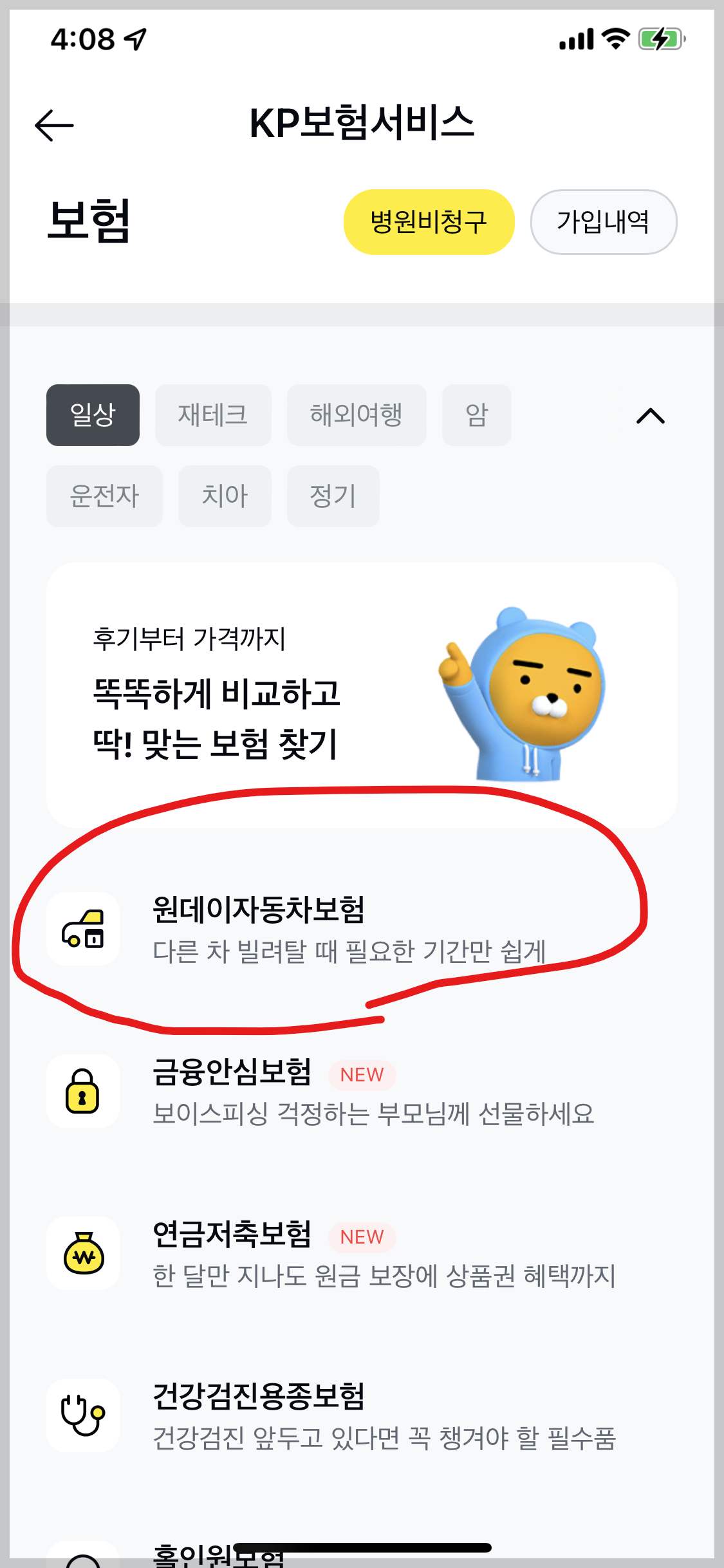 (5) '원데이자동차보험' 보이시죠? 여기서부터 가입하시면 됩니다. 이렇게 숨어있어서 기능이 있다고 해도 못 찾을 정도네요.