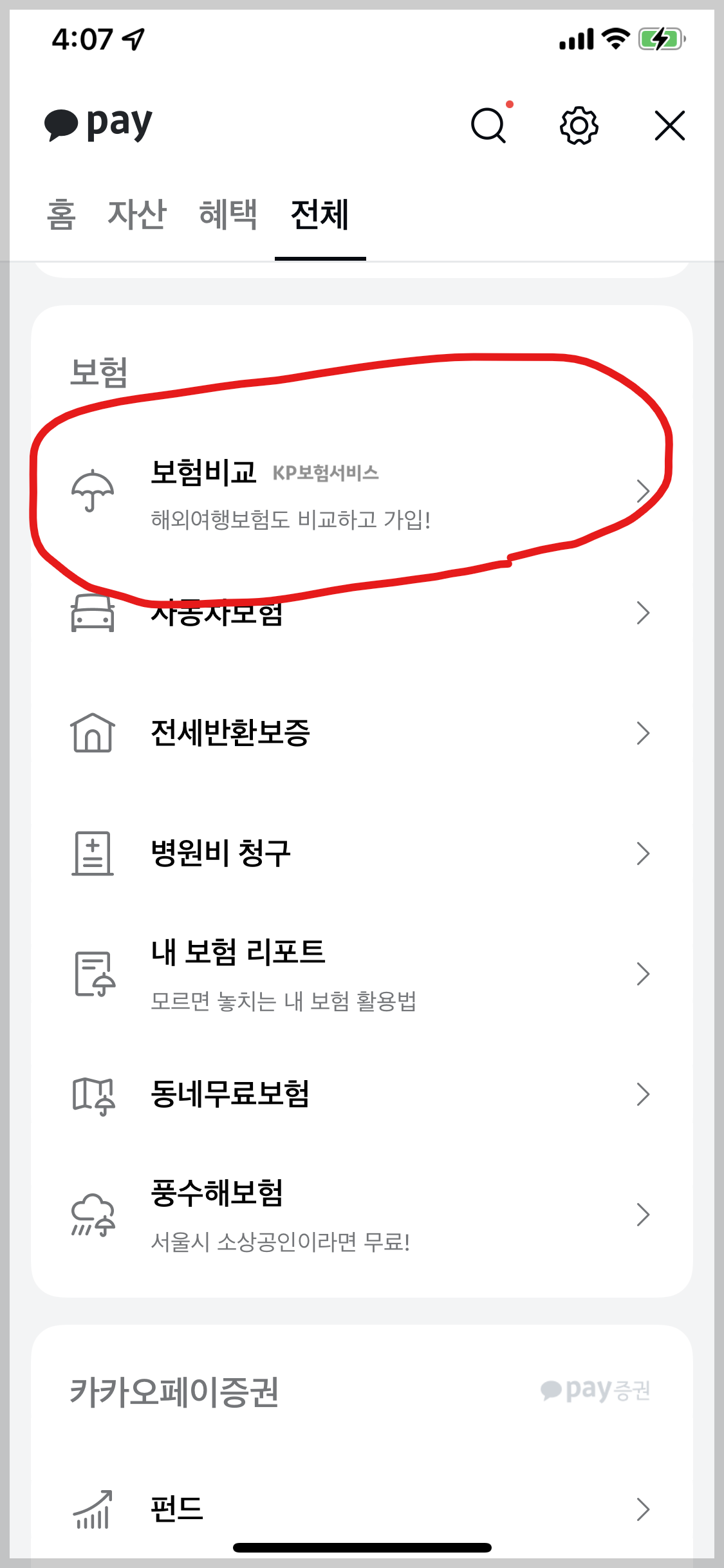 (4) 보험 항목을 찾아서 '보험비교'를 터치합니다.