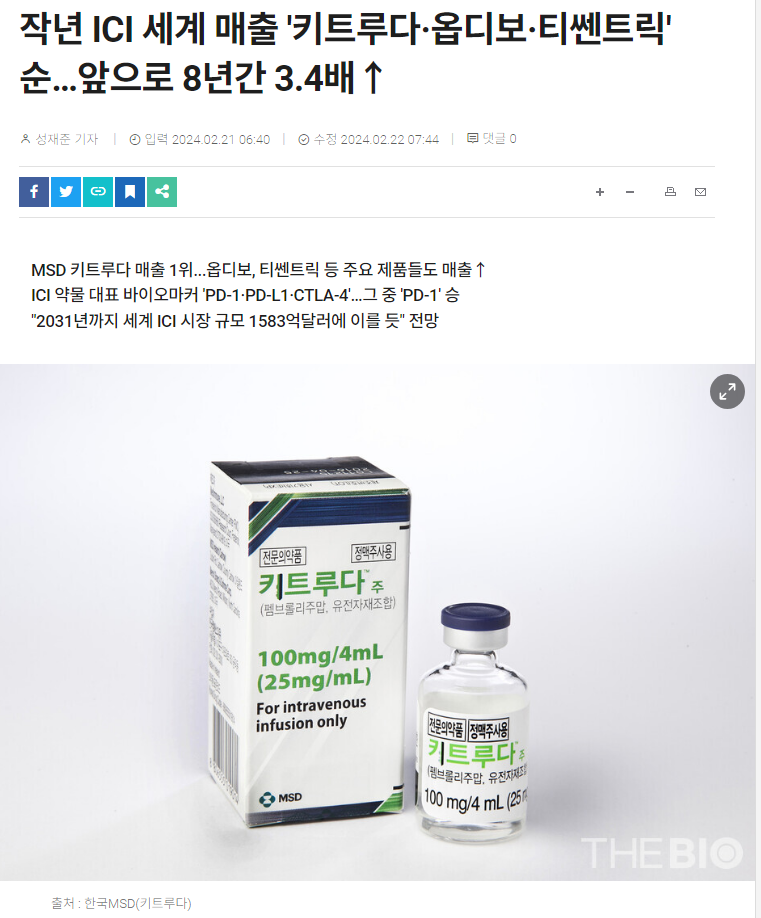 위 기사에서는 퓨처와이즈 마켓리서치 자료를 인용해서 작년 472억 달러에서 2031년 1,582억달러, 3.5배 증가할 것으로 전망했다. 그런데 이건 키트루다만의 성장이 아니어서, 좀 더 참고할 자료가 필요하다.